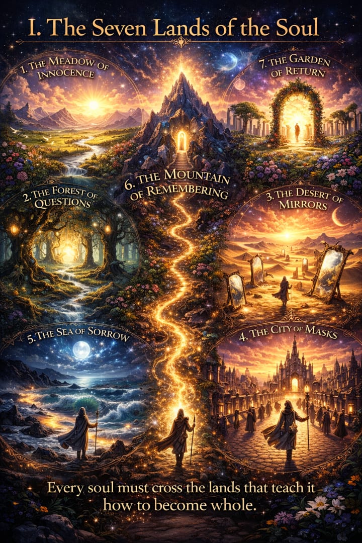 The elders say the soul does not cross life in a straight line. It passes through lands. Seven, to be exact. Some people move through them quickly. Some build homes in one and refuse to leave. Some circle back again and again, mistaking a return for failure, not realizing the lands reveal new meanings each time they are crossed. No traveler is given the full map at the beginning. That would make the journey too easy, and far less holy. Instead, each person enters through mist. And the first land always appears just as the traveler is learning how to say, I am here.
