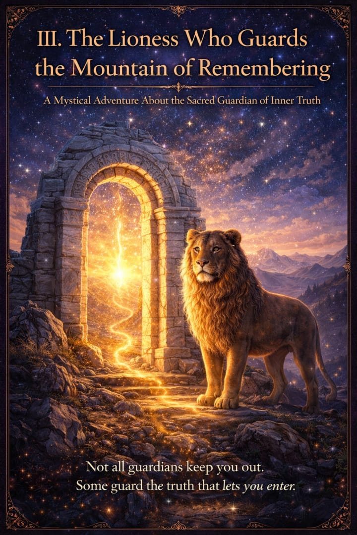 Long before the roads were named, before maps were drawn, before travelers learned to carry lanterns, there stood a mountain in the center of the world. And upon that mountain lived a lioness. Not an ordinary lioness. She was older than empires. Older than doctrine. Older than every language humans now use to describe courage. Her fur held the color of dusk-gold and earth-fire. Her eyes were not cruel, but they missed nothing. Around her moved an air so still that even frightened hearts began to hear themselves more clearly in her presence. She was called many names by many peoples. Keeper of the Threshold. Mother of the Unmasked. Guardian of the True Road. She-Who-Remembers-What-You-Are. But the oldest name for her was simply this: The Lioness of Remembering. No traveler reached the summit of the mountain without meeting her. Some heard her before they saw her. A low sound in the wind. A vibration through the stone. A summons that was not heard with the ears, but with the bones. Those who came to the mountain seeking status turned back quickly. Those who came seeking spiritual trophies found the path vanish beneath them. Those who came hoping the mountain would make them special discovered that the mountain had no interest in performance. But those who came broken open by life, carrying honest questions, were allowed to continue. At the final ridge, the traveler would find her waiting beside an ancient gate of white stone. She never asked for names. Names were too easy. Instead, she asked questions like these: What have you outgrown but still obey? What mask calls itself protection but is really fear? What truth has been knocking beneath your ribs? What part of you have you exiled in order to belong? Many travelers wept before answering. Some tried to lie. The mountain did not punish them. It simply echoed their lie back until they could hear its hollowness for themselves. That was the Lioness’s way. She did not shame. She clarified. If the traveler answered honestly, she would rise and circle them once. As she passed, something invisible would begin to fall away. Not skin. Not clothing. Not memory. Falsehood. The roles they had fused with. The identities built only for survival. The silent contracts they had made with unworthiness. Some described it as relief. Some as terror. Some as a death. Some as the first real breath they had ever taken. When the Lioness completed her circle, she would touch the traveler’s chest lightly with one great paw. Where she touched them, a symbol appeared. Different for each person. A star. A river. A gate. A flame. A tree. A key. A compass rose. This was not decoration. It was recognition. A mark of essence. A sign of what the soul had come to embody. Only then would the Lioness speak the words every true traveler longs and fears to hear: You may pass. But not as the one who arrived. Beyond her gate lay the summit, where the map opened and the larger pattern could be seen. But many travelers, once blessed by the Lioness, chose to remain near her for a while. Not forever. Just long enough to learn the feel of their own unmasked presence. They sat in the mountain grass while dawn painted the stones. They listened to the wind move through old arches. They watched the Lioness sleep with one eye half open, as if even in rest she guarded truth. Some asked her if she was lonely. She only blinked slowly and looked out over the valleys below. For the Lioness knew something most travelers take years to understand: To guard truth is not to stand apart from love. It is one of love’s fiercest forms. And every traveler who descended the mountain carried her with them afterward. Not as a memory only. As a standard. A steadiness. A sovereign pulse. A refusal to betray the soul for applause. That is why sometimes, in the middle of ordinary life, a person suddenly stops shrinking. Suddenly speaks. Suddenly leaves. Suddenly stands. Suddenly remembers. It is said that in such moments, though no one else can see her, the Lioness is walking beside them.