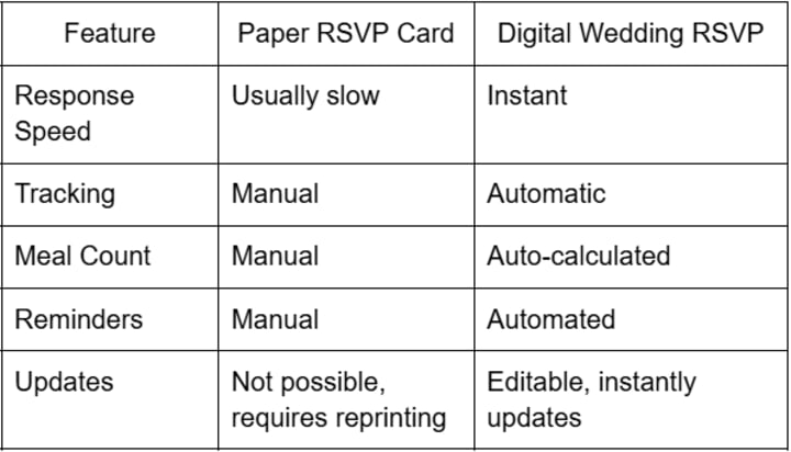 Digital Wedding RSVP vs Paper RSVP Card Comparison Table