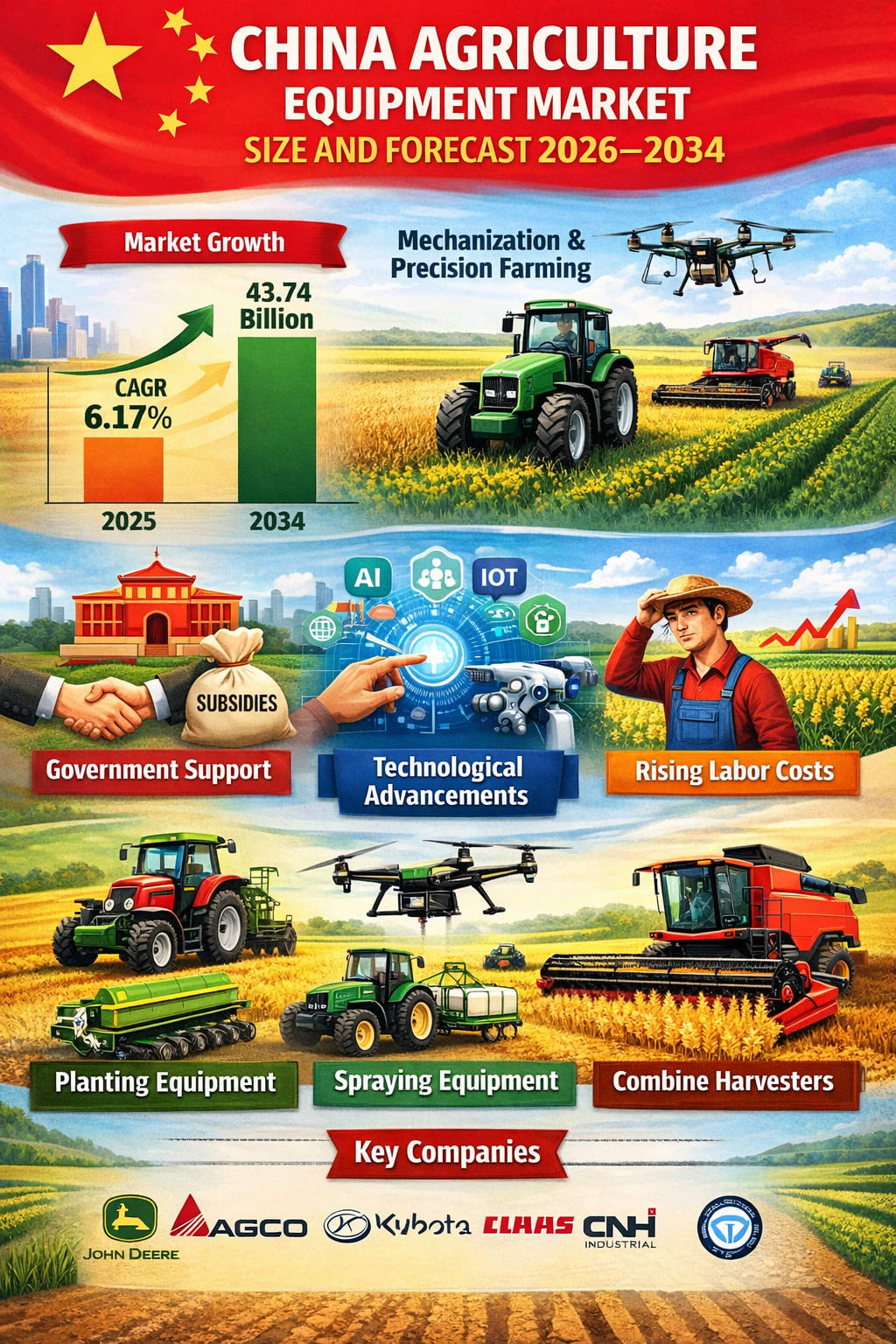 China’s agriculture sector is undergoing a profound transformation. As rural labor shrinks and urbanization accelerates, farms across the country are turning toward mechanization and digital solutions to maintain productivity and ensure food security. According to Renub Research, the China Agriculture Equipment Market is projected to grow from US$ 25.52 billion in 2025 to US$ 43.74 billion by 2034, expanding at a CAGR of 6.17% from 2026 to 2034.