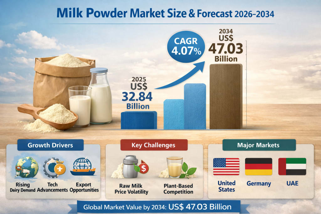 The global milk powder market is poised for consistent and resilient growth over the next decade. According to Renub Research, the Milk Powder Market is expected to increase from US$ 32.84 billion in 2025 to US$ 47.03 billion by 2034, expanding at a CAGR of 4.07% from 2026 to 2034. This steady growth trajectory reflects the increasing role of milk powder in food processing, infant nutrition, dietary supplements, and global dairy trade.