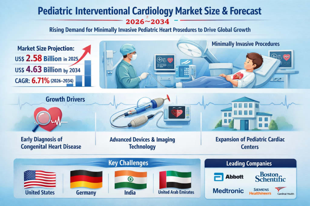 The global Pediatric Interventional Cardiology Market is entering a transformative growth phase. According to Renub Research, the market is projected to rise from US$ 2.58 billion in 2025 to US$ 4.63 billion by 2034, expanding at a CAGR of 6.71% from 2026 to 2034.