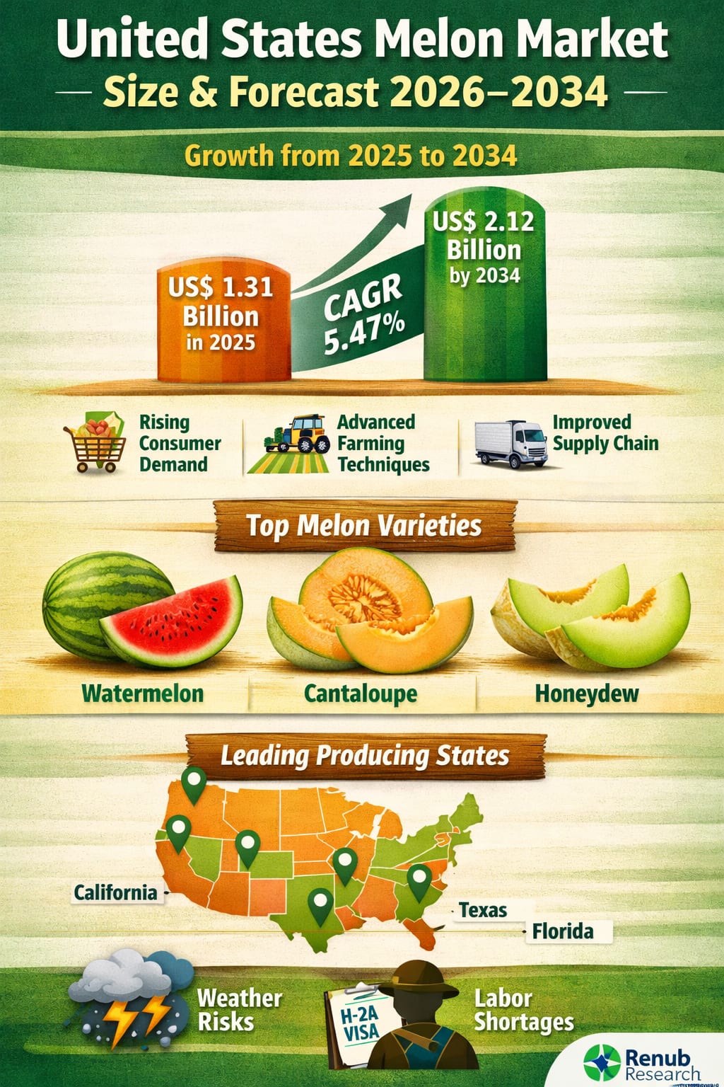 The United States melon market stands at the intersection of health-driven consumption trends and agricultural innovation. With Renub Research projecting growth from US$ 1.31 billion in 2025 to US$ 2.12 billion by 2034, the industry demonstrates both resilience and opportunity.